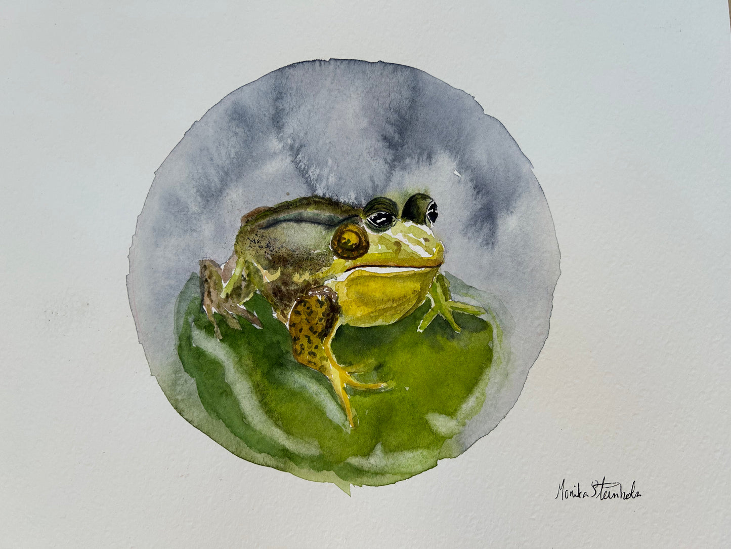 Ikke bare har prinsen blitt forvandlet til en frosk. Han har også mistet kronen sin, men han har ikke mistet motet likevel. Kyss meg! Kvekk! Kyss meg! Kvekk! synger han når han hopper fra vannlijeblad til vannlijeblad.